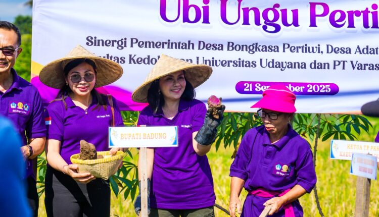 Ketua TP PKK Badung Ny. Adi Arnawa menghadiri kegiatan panen perdana ubi ungu dan temu rasa dengan lansia Desa Bongkasa Pertiwi di Wantilan Pura Dalem Banjar Karang Dalem II, Desa Bongkasa Pertiwi, Kecamatan Abiansemal, pada Minggu (21/9/2025).