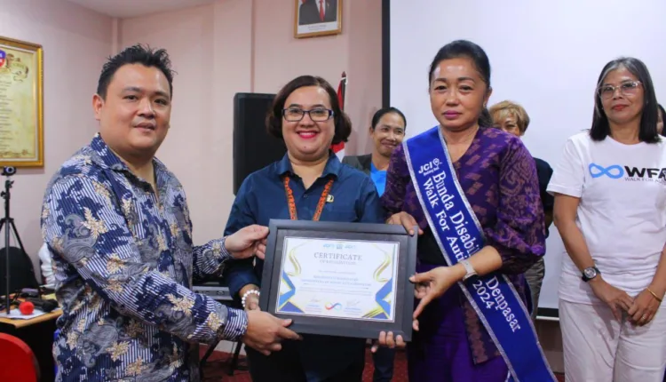 Ketua Koordinator Kegiatan Kesejahteraan Sosial (KKKS) Kota Denpasar, Ny. Jaya Negara menerima apresiasi dari Junior Chamber International (JCI) Indonesia melalui JCI Badung Bali, di Aula LSPR Renon, pada Jumat (14/6/2024).
