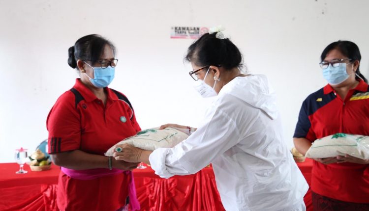 Ketua TP PKK Provinsi Bali, Ny. Putri Koster didampingi Ketua TP.PKK Kabupaten Gianyar, Ny. Surya Adnyani Mahayastra menyerahkan bantuan beras kepada anggota PKK Desa Buruan Blahbatuh, di Kantor Perbekel Desa Buruan Blahbatuh Gianyar, pada Jumat (12/2).