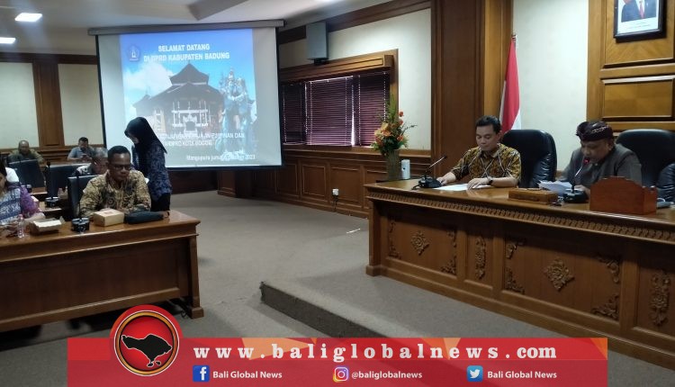 Anggota Badan Anggaran DPRD Kabupaten Badung, Nyoman Satria, menerima kunjungan kerja (kunker) Badan Anggaran DPRD Kota Bogor di Ruang Sidang Gosana II, Sekretariat DPRD Puspem Badung, pada Jumat (6/10/2023).