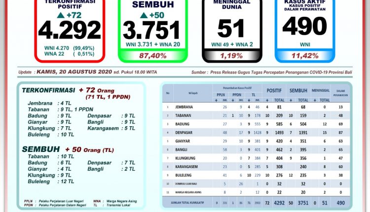 Kadis Kominfo Badung, IGN Gde Jaya Saputra, mengatakan ada penambahan 9 kasus positif pada Kamis (20/8), sehingga total kasus positif Covid-19 di Badung kini menjadi 585 orang, terdiri atas 125 PDP, 44 ODP, 400 OTG, 16 PMI.