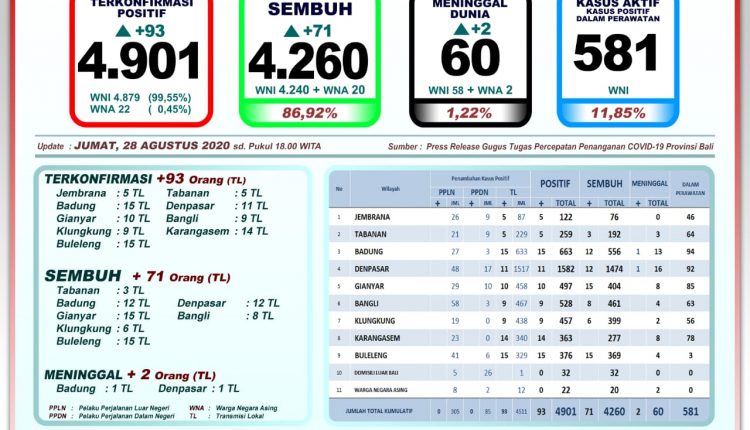 Perkembangan pandemi Covid 19 di Provinsi Bali pada Jumat (28/8) terkonfirmasi positif 93 orang melalui transmisi lokal, kasus sembuh 71 orang dan 2 pasien meninggal dunia.