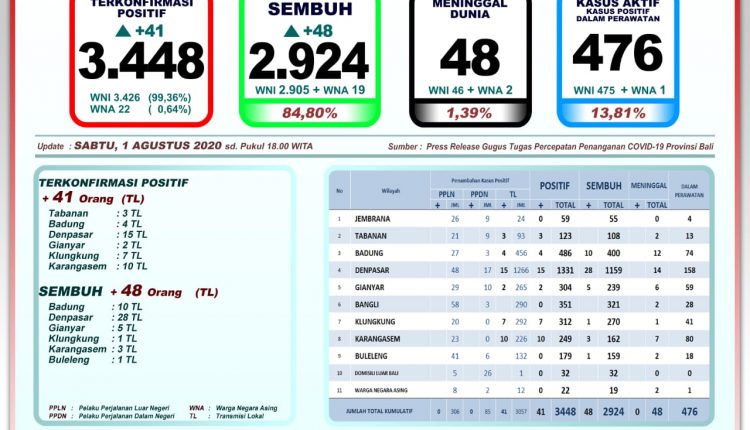 Gugus Tugas Percepatan Penanganan Covid-19 Provinsi Bali menyampaikan perkembangan Penanganan Corona Virus Disease (COVID-19) di Provinsi Bali per Sabtu (1/8), Jumlah kumulatif pasien positif hari ini bertambah 41 transmisi lokal, sehingga totalna mencapai 3.448 orang.