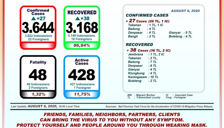 Jumlah angka positif di Bali sebagian besar masih didominasi oleh transmisi lokal secara komulatif sebanyak 3.252 orang terdiri dari 3.240 WNI dan 12 WNA. Meskipun data kesembuhan pasien Covid-19 mengalami peningkatan, kami tetap mengajak semua lapisan masyarakat untuk tetap menjaga diri dan kesehatannya, dengan menerapkan protokol kesehatan dimana saja dan kapan saja sehingga antara satu orang dan yang lainnya akan saling menjaga.