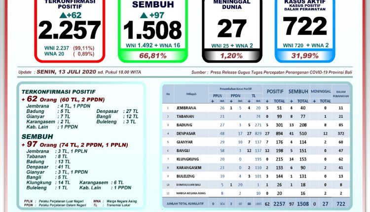 Pasien terkonfirmasi positif Covid-19 di Provinsi Bali pada Senin (13/7) bertambah 62 orang WNI dengan rincian 60 orang transmisi lokal dan 2 orang kasus perjalanan. Dengan demikian, jumlah kumulatif pasien positif menjadi 2.257 orang. Demikian Gugus Tugas Percepatan Penanganan COVID-19 Provinsi Bali menyampaikan perkembangan penanganan Covid-19.