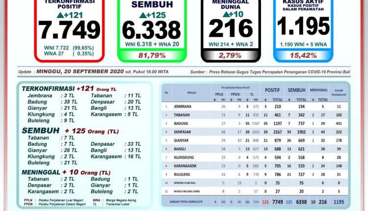 Perkembangan pandemi Covid-19 di Bali pada Minggu (20/9) terkonfirmasi 121 orang melalui transmisi lokal, sembuh 125 orang dan meninggal dunia 10 orang.