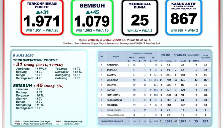 Gugus Tugas Percepatan Penanganan COVID-19 Provinsi Bali menyampaikan perkembangan penanganan Corona Virus Disease (COVID-19) di Provinsi Bali per Rabu (8/7). Jumlah pasien positif bertambah 31 orang WNI, terdiri dari 30 transmisi lokal dan 1 kasus impor. Secara kumulatif total pasien positif berjumlah 1.971 orang.