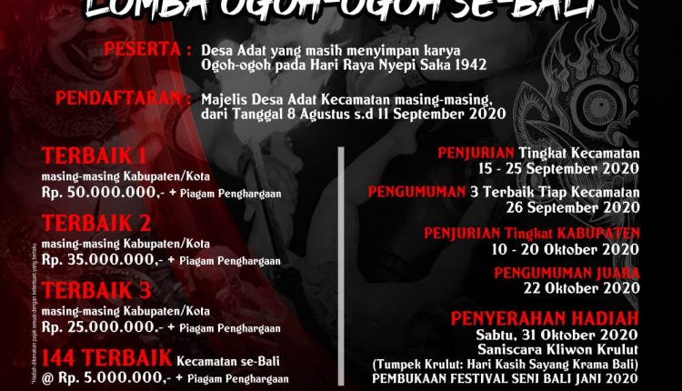 ”Setelah memperhatikan perkembangan pandemi Covid-19 saat ini, khususnya di Bali, Bapak Gubernur menyampaikan permohonan maaf, karena belum bisa melaksanakan festival/parade Ogoh-Ogoh pada tanggal 8 Agustus 2020 seperti yang direncanakan sebelumnya. Festival dalam format lomba tersebut, sesuai arahan Gubernur, tetap dilaksanakan dengan puncaknya pemberian hadiah bagi pemenang pada Tumpek Krulut, Hari Kasih Sayang Krama Bali, Sabtu, 31 Oktober 2020. Sekaligus pula pada momen itu juga digelar Pembukaan Festival Seni Bali Jani,” kata Kepala Dinas Komunikasi, Informatika dan Statistik Provinsi Bali, Gede Pramana di Denpasar, Rabu (15/7).