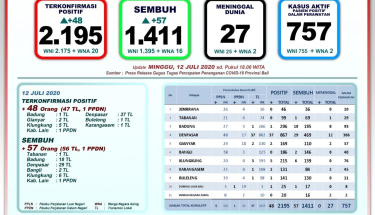 Jumlah pasien positif Covid-19 di Bali bertambah 48 orang WNI, terdiri dari 47 transmisi lokal, 1 pelaku perjalanan dalam negeri (PPDN). Secara kumulatif, total pasien positif berjumlah 2.195 orang. Demikian disampaikan Gugus Tugas Percepatan Penanganan Covid-19 Provinsi Bali terkait perkembangan penanganan Covid-19 di Provinsi Bali per Minggu (12/7).