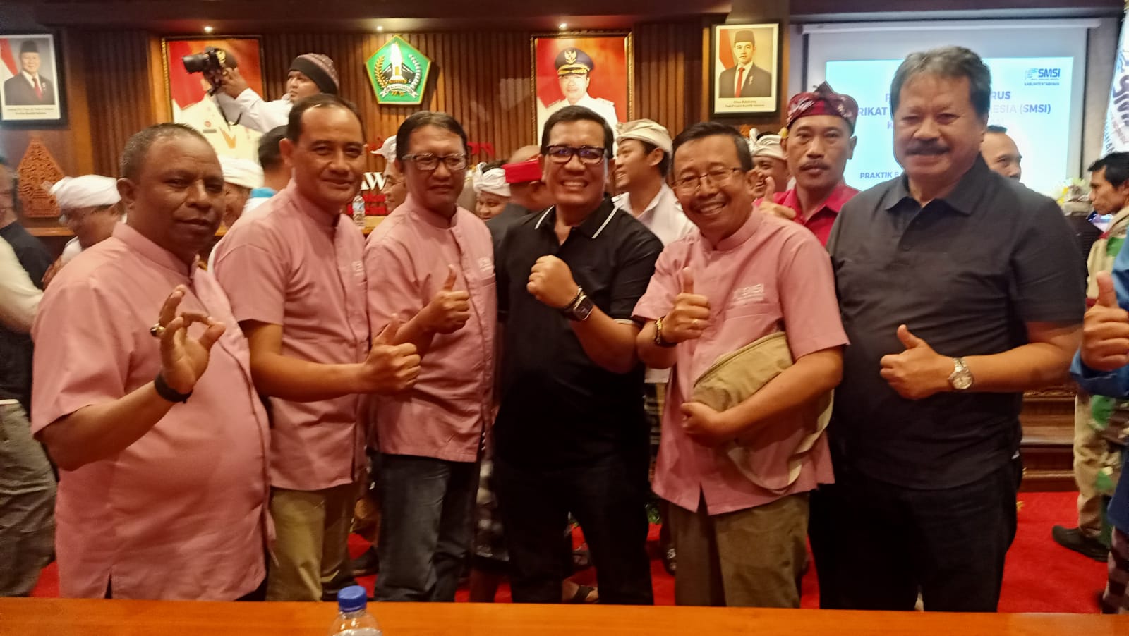 Pengurus Serikat Media Siber Indonesia (SMSI) Kabupaten Badung dengan kostum khasnya berwarna pink magenta menghadiri pengambilan sumpah/janji dan pelantikan pengurus SMSI Kabupaten Tabanan periode 2024-2027 pada Jumat (20/12/2024).