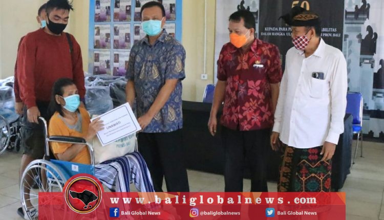 Sekda Dewa Indra didampingi oleh Kepala Dinas Sosial, Pemberdayaan Perempuan dan Perlindungan Anak Provinsi Bali, Dewa Gede Mahendra Putra, menyerahkan secara simbolis 2 kursi roda dan paket sembako kepada para penyandang tuna daksa.