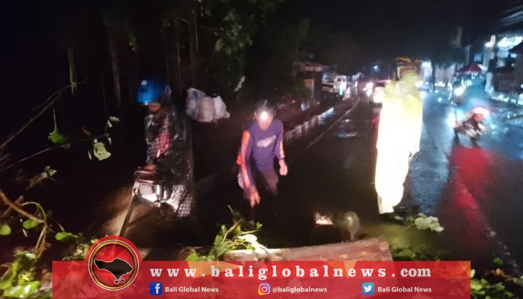Hujan deras dan angin kencang yang melanda wilayah Kecamatan Abiansemal telah menyebabkan pohon di pinggir jalan di sebelah utara jembatan Sibanggede, Kecamatan Abiansemal, Badung, tumbang pada Jumat (25/2) pukul 20.30 Wita.