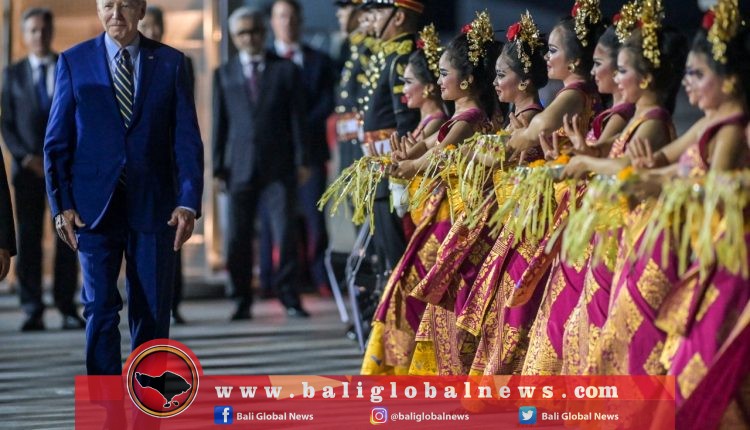 Presiden Amerika Serikat, Joe Biden, disambut puluhan penari Pendet, saat tiba di Bandara I Gusti Ngurah Rai, Provinsi Bali, pada Minggu (13/11/2022), pukul 22.00 Wita.