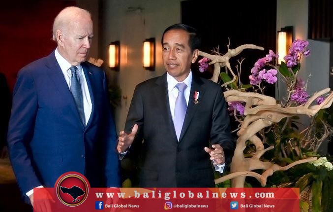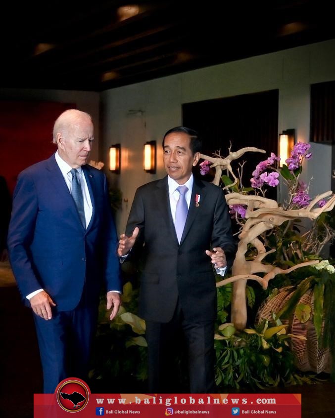 Jelang puncak KTT G20, Presiden Indonesia, Joko Widodo, membahas penguatan kerjasama ekonomi Indo-Pasifik, saat melakukan pertemuan bilateral dengan Presiden Amerika Serikat Joe Biden, di Pulau Bali, pada Senin (14/11/2022).