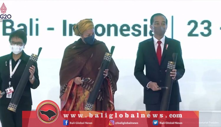 Presiden Joko Widodo (Jokowi) bersama Deputy Secretary General dan perwakilan delegasi membunyikan kulkul atau kentongan Bali saat membuka secara resmi GPDRR ke-7 di BNDCC, Bali, pada Rabu (25/5). Pembukaan dihadiri secara fisik maupun virtual dari berbagai negara.