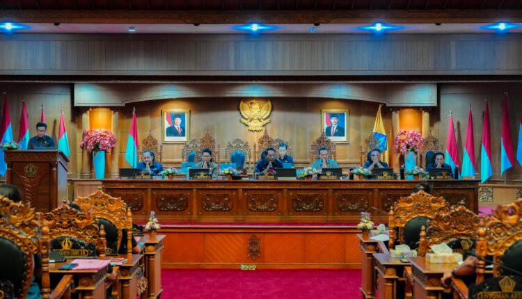 Bupati Badung I Wayan Adi Arnawa didampingi Wakil Bupati Bagus Alit Sucipta menghadiri rapat paripurna dengan agenda Penyampaian Pandangan Umum Fraksi-fraksi DPRD Kabupaten Badung terhadap dua dokumen Rancangan Peraturan Daerah (Raperda) yakni Raperda tentang Anggaran Pendapatan dan Belanja Daerah (APBD) Tahun Anggaran 2026 dan Raperda tentang Pemberian Insentif dan/atau Kemudahan Penanaman Modal di Ruang Sidang Utama Gosana, Sekretariat DPRD Puspem Kabupaten Badung pada Selasa (4/11/2025).