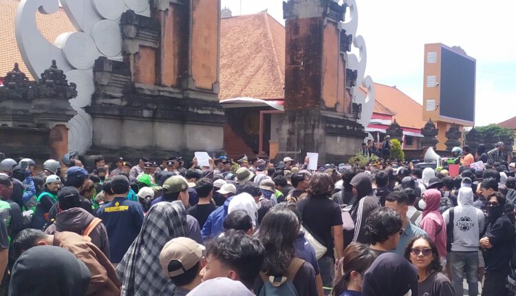Ratusan orang pendemo dari ojek online dan mahasiswa di Pulau Bali menggeruduk Kantor Mapolda Bali pada Sabtu (30/8/2025). Kedatangan ratusan pendemo ini guna menuntut keadilan atas tewasnya salah satu ojek online yang ditabrak mobil rantis Brimob pada Jumat (29/2025) dini hari.