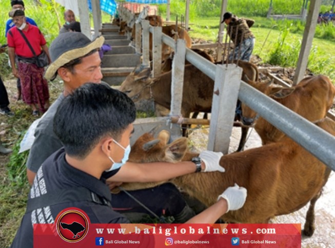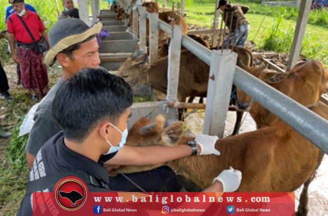 Tim Relawan PMK Fakultas Kedokteran Hewan (FKH) Universitas Udayana (Unud) bersama dengan Dinas Pertanian Kabupaten Klungkung memvaksinasi sekaligus mendata sapi di Desa Getakan, Kecamatan Banjarangkan, Kabupaten Klungkung.