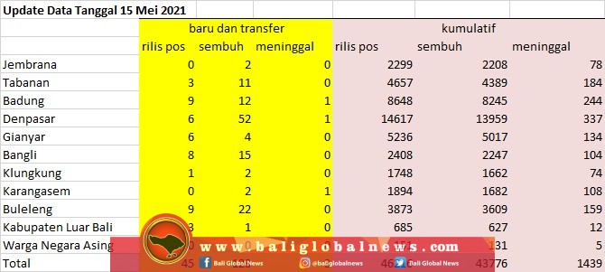 Pertambahan kasus terkonfirmasi positif Covid-19 di Provinsi Bali pada Sabtu (15/5) mencapai 45 orang (41 orang melalui transmisi lokal, 2 PPDN dan 2 PPLN), sembuh 123 orang, dan 3 orang meninggal dunia.