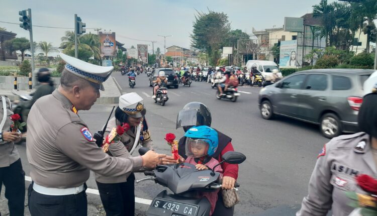 Selain membagikan bunga mawar dan cokelat, petugas juga mengecek kendaraan dan pengguna jalan serta memberikan imbauan dan edukasi tentang keselamatan lalu lintas.