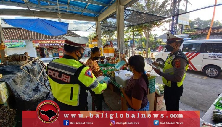 Satlantas Polres Badung membagikan masker di Pasar Rakyat Umasari, Desa Denkayu, Kecamatan Mengwi, Badung, dan mengimbau tentang protokol kesehatan (prokes) kepada masyarakat Kamis (16/9)
