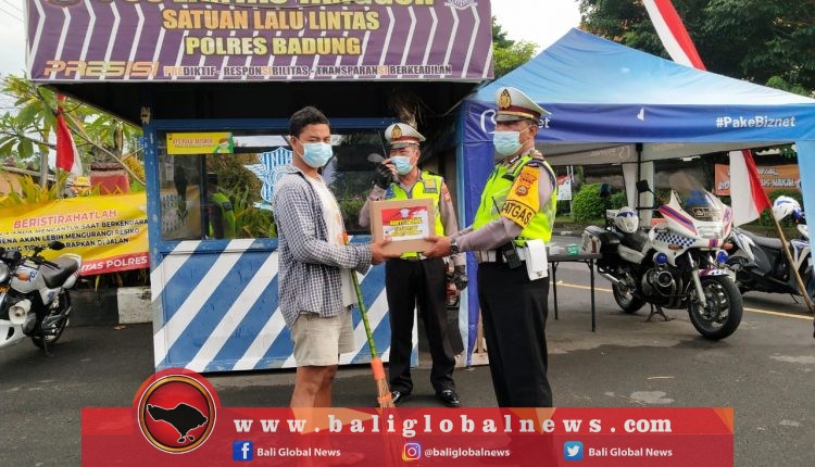 Satlantas Polres Badung terus gelar aksi bagi-bagi masker dan sembako ke masyarakat, guna menekan penyebaran Covid -19 di pulau Dewata khususnya kabupaten Badung.