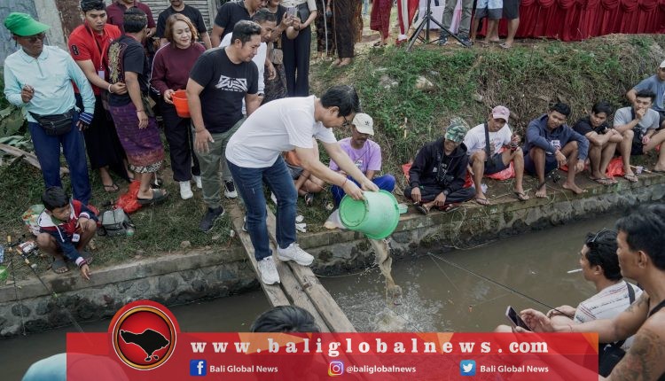 menghadiri sekaligus membuka lomba mancing air deras serangkaian HUT ke-48 ST Adnya Putra, Banjar Taman, Darmasaba, ditandai dengan menebar ikan lele di aliran Irigasi Pasekan Banjar Taman, Desa Darmasaba, Abiansemal, pada Minggu (14/1/2024).