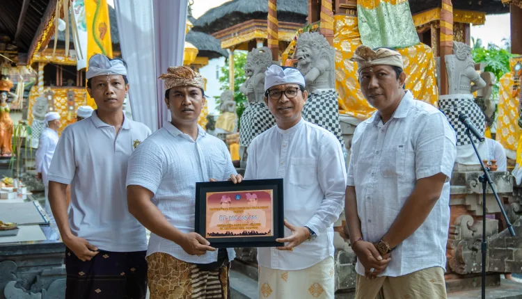 Sebagai wujud dukungan dari pemerintah, Sekda Adi Arnawa menyerahkan bantuan dana BKK tahun 2023 secara simbolis Rp368 juta untuk pembangunan fisik Pura Batu Jelantik yang diterima Ketua Panitia Karya.