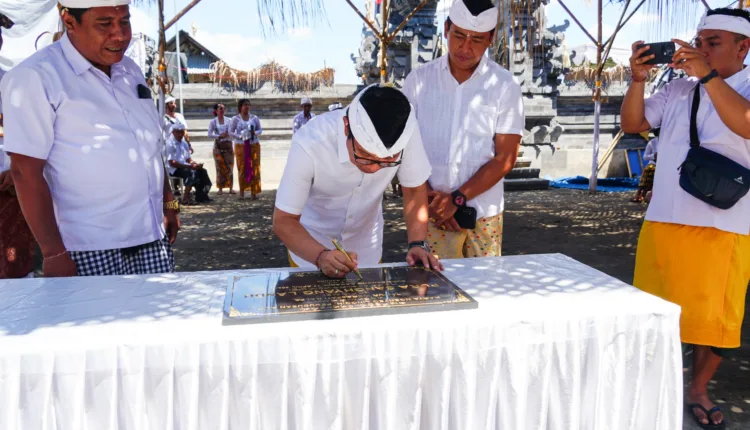 Sekda Wayan Adi Arnawa mewakili Bupati Badung menghadiri karya mendem pedagingan karya ngenteg linggih, pedudusan alit, tawur wraspati kalpa di Pura Sang Hyang Landu dan memberikan paraf di prasasti, Banjar Gelagah Puwun, Desa Kekeran, Mengwi, pada Senin (15/4/2024).
