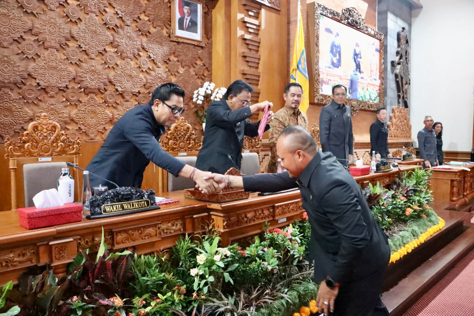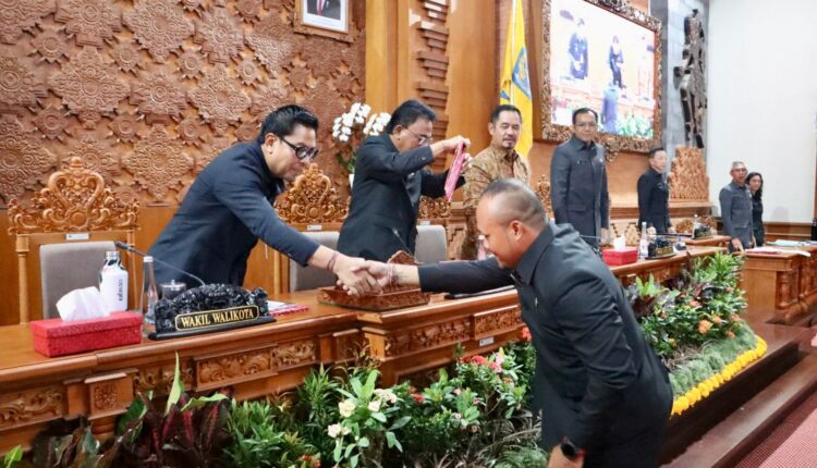 Seluruh Fraksi DPRD Kota Denpasar secara resmi menyetujui penetapan dua Rancangan Peraturan Daerah (Ranperda) dalam Penutupan Rapat Paripurna ke-39 Masa Persidangan III DPRD Kota Denpasar yang dipimpin Ketua DPRD Kota Denpasar I Gusti Ngurah Gede bersama Wakil Ketua, I Wayan Mariyana Wandhira dan Wakil Made Oka Cahyadi Wiguna di Gedung DPRD Kota Denpasar pada Jumat (17/10/2025). Keduanya yakni Rancangan Peraturan Daerah (Ranperda) tentang Penambahan Penyertaan Modal Pada Perseroan Terbatas Bank Pembangunan Daerah Bali Tahun Anggaran 2025 dan Rancangan Peraturan Daerah Tentang Anggaran Pendapatan Dan Belanja Daerah (APBD) Kota Denpasar Tahun Anggaran 2026.