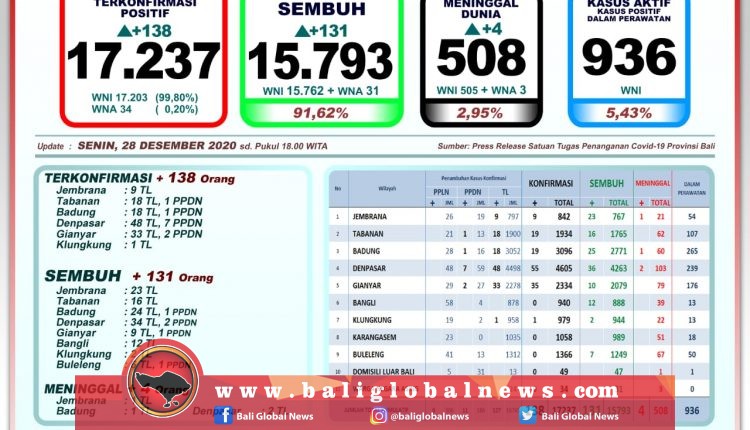 Perkembangan pandemi Covid-19 di Provinsi Bali yang sempat di dua angka digit, pada Senin (28/12) kembali ke angka tiga digit, dengan terkonfirmasi positif 138 orang (127 orang melalui transmisi lokal dan 11 PPDN), sembuh 131 orang, dan 4 orang meninggal dunia.