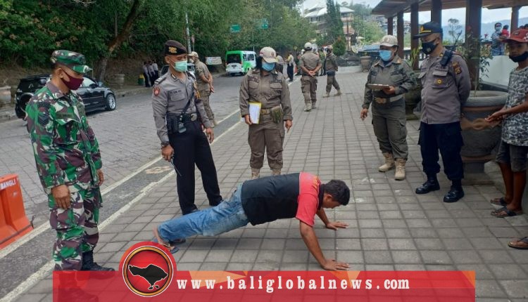 “Operasi Yustisi ini dilakukan setiap hari secara terus-menerus dan berkesinambungan di beberapa tempat secara stasioner maupun mobiling sampai pelosok desa di seluruh wilayah Bangli. Bukan hanya menyasar objek wisata saja tapi menyasar ke tempat tempat yang bisa menimbulkan kerumunan, kali ini kebetulan di objek wisata di Kintamani dan beberapa objek wisata lainnya dan ada 16 pengunjung obyek wisata yang terjaring di wilayah Kintamani, kebanyakan tidak menggunakan masker,” ujarnya.Dia menyebutkan sanksi yang diterapkan terhadap para pelanggar prokes bervariasi yaitu 6 orang teguran lisan, 3 sanksi sosial menyapu jalanan dan nyanyi dan 7 orang sanksi fisik berupa push up, dan semua identitas pelanggar prokes dicatat oleh petugas kami.