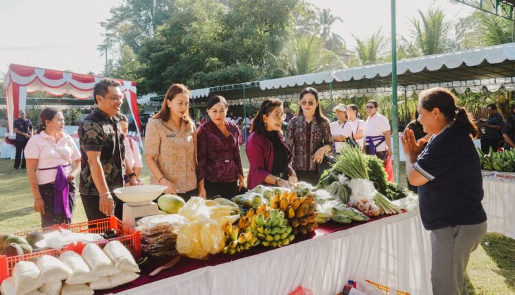 Ketua Tim Penggerak (TP) PKK Kabupaten Badung Nyonya Adi Arnawa didampingi Nyonya Alit Sucipta menghadiri kegiatan gerakan pangan murah (GPM) dalam rangka menyongsong Hari Raya Kuningan serta menjaga stabilitas pasokan dan harga pangan di lapangan depan Kantor Desa Bongkasa, Kecamatan Abiansemal, pada Selasa (29/4/2025).