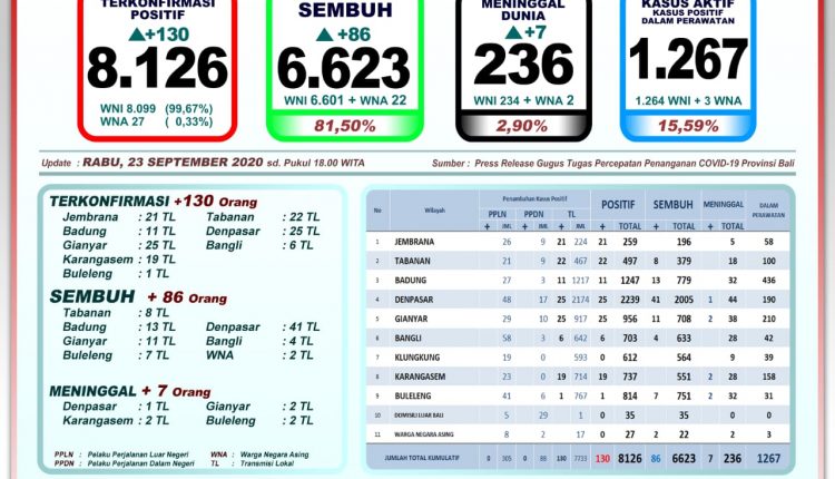 Perkembangan pandemi Covid-19 di Provinsi Bali pada Rabu (23/9) terkonfirmasi 130 orang melalui transmisi lokal, sembuh 86 orang dan meninggal dunia 7 orang.