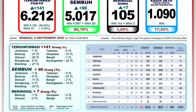 Perkembangan pandemi Covid-19 di Provinsi Bali pada Minggu (6/9) terkonfirmasi 141 orang melalui transmisi lokal, kasus sembuh 90 orang dan 7 pasien terkonfirmasi meninggal dunia.