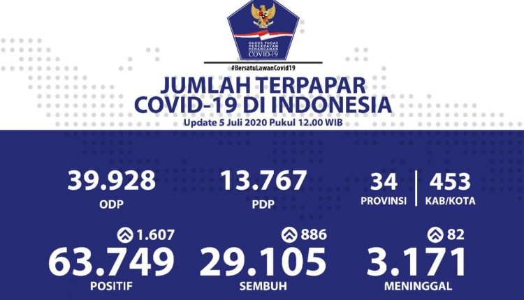 Selanjutnya, secara nasional kasus Positif bertambah 1.607 yang jika dijumlahkan secara keseluruhan jumlah orang yang positif corona di seluruh Indonesia menjadi 63.749 kasus.