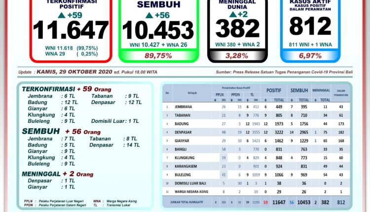 Perkembangan pandemi Covid-19 di Provinsi Bali pada Kamis (29/10) terkonfirmasi 59 orang melalui transmisi lokal, sembuh 56 orang dan meninggal dunia 2 orang.