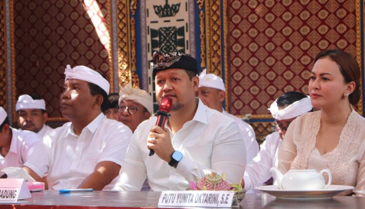 Wakil Bupati (Wabup) Badung Bagus Alit Sucipta didampingi Nyonya Yunita Alit Sucipta menghadiri karya dewa yadnya ngelinggihang, padudusan alit di Merajan Gede Pratisentana Penyarikan Dalem Kedonganan, Desa Adat Kedonganan, Kuta, Rabu (24/9/2025). Upacara ini juga dirangkaikan dengan karya manusa yadnya ngangkid, mepetik, dan mepandes, yang dipuput oleh Ida Pedanda Gede Made Karang dari Griya Karang Tampakgangsul, Denpasar. Sebagai wujud dukungan pelestarian seni, budaya, adat, dan agama, Wabup menyerahkan punia Rp10 juta yang diterima panitia karya.