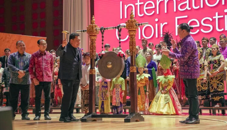 Wakil Bupati (Wabup) Badung, I Ketut Suiasa, menghadiri sekaligus membuka acara Opening Ceremony Bali International Choir Festival yang ditandai dengan memukul gong di Gedung Balai Budaya Giri Nata Mandala Puspem Badung pada Selasa (23/7/2024).