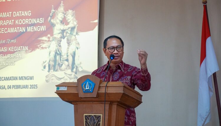 Wakil Bupati Badung I Ketut Suiasa, memberikan pengarahan dalam acara rapat koordinasi (rakor) tingkat Kecamatan Mengwi, dengan tema “Sinkronisasi Kegiatan Desa/Kelurahan Tahun 2025” pada Selasa (4/2/2025). Acara berlangsung di ruang rapat Nagarabhakti, Kantor Camat Mengwi dan dihadiri Camat Mengwi I Nyoman Suhartana beserta Tripika Mengwi, perbekel/lurah se-Kecamatan Mengwi, LPM, serta undangan lainnya.