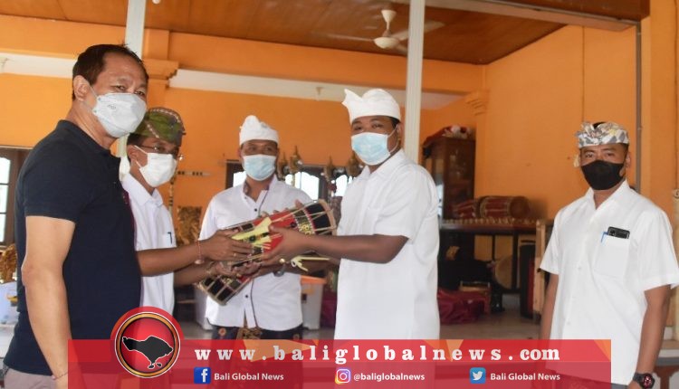 Wakil Bupati Badung, I Ketut Suiasa, menyerahkan bantuan gambelan angklung kepada krama Banjar Seseh, Desa Adat Seseh, Desa Cemagi, Kecamatan Mengwi, Minggu (11/4) di Balai Suka Duka Br. Seseh.