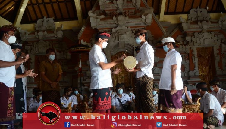 Wakil Bupati Badung, I Ketut Suiasa, menyerahkan bantuan gamelan angklung kepada Sanggar Sancita Werdhi, Banjar Panti Giri, Desa Kutuh, Kecamatan Kuta Selatan, Minggu (4/4).