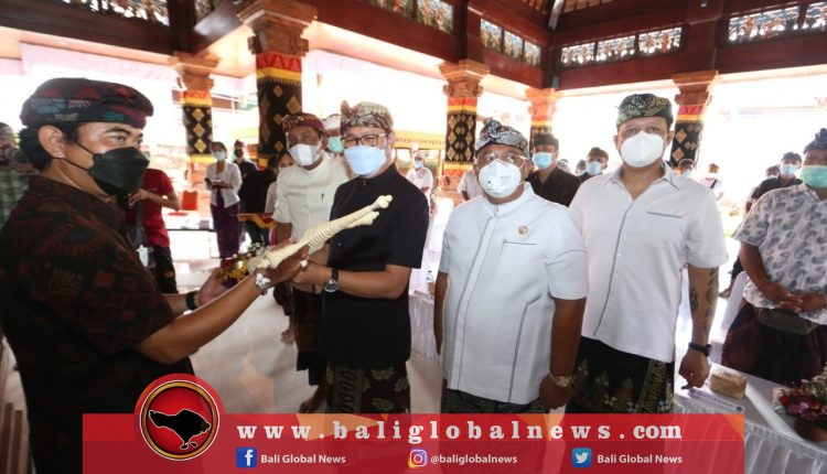 Wakil Bupati Badung, I Ketut Suiasa, didampingi Ketua DPRD Badung, I Putu Parwata, menyerahkan bantuan seperangkat gong Semarandana kepada krama Banjar Adat Seminyak Kaja dan SK Bupati Badung tentang pemanfaatan lahan untuk pembangunan Pura Pancung Segara kepada krama pangempon Pura Pancung Segara di Balai Banjar Seminyak, Kelurahan Seminyak, Desa Adat Seminyak, Kecamatan Kuta, Selasa (2/3).