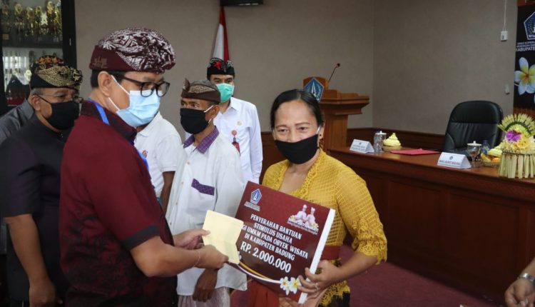 Pemerintah Kabupaten Badung melalui Dinas Koperasi, UKM dan Perdagangan kembali merealisasikan bantuan stimulus tahap kedua bagi pelaku UMKM objek wisata di wilayah Kuta Selatan, Kamis (9/7), dari Anggaran Pendapatan dan Belanja Daerah (APBD) Kabupaten Badung 2020. Sebelumnya bantuan stimulus serupa diberikan kepada pelaku usaha mikro kecil dan menengah (UMKM) di Objek Wisata Sangeh.