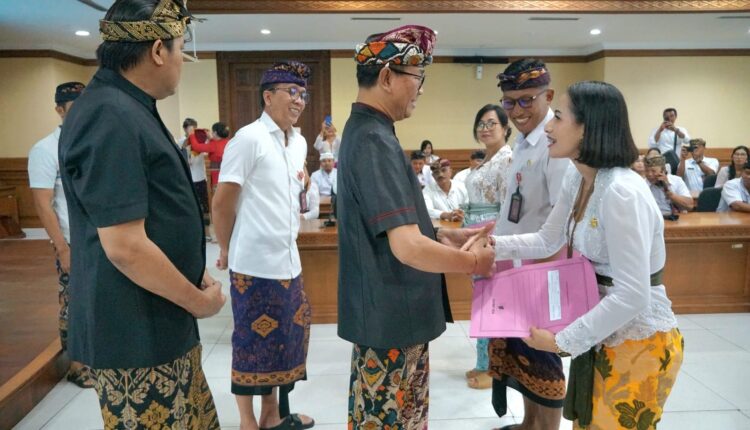 Wakil Bupati Badung I Ketut Suiasa didampingi Anggota DPRD I Made Suwardana, Kepala Disdikpora Gusti Made Dwipayana menyerahkan surat keputusan (SK) pengangkatan kepala sekolah dasar negeri (SD) dan sekolah menengah pertama negeri (SMP) Kabupaten Badung di Ruang Kriya Gosana, Puspem Badung, pada Kamis (30/1/2025).