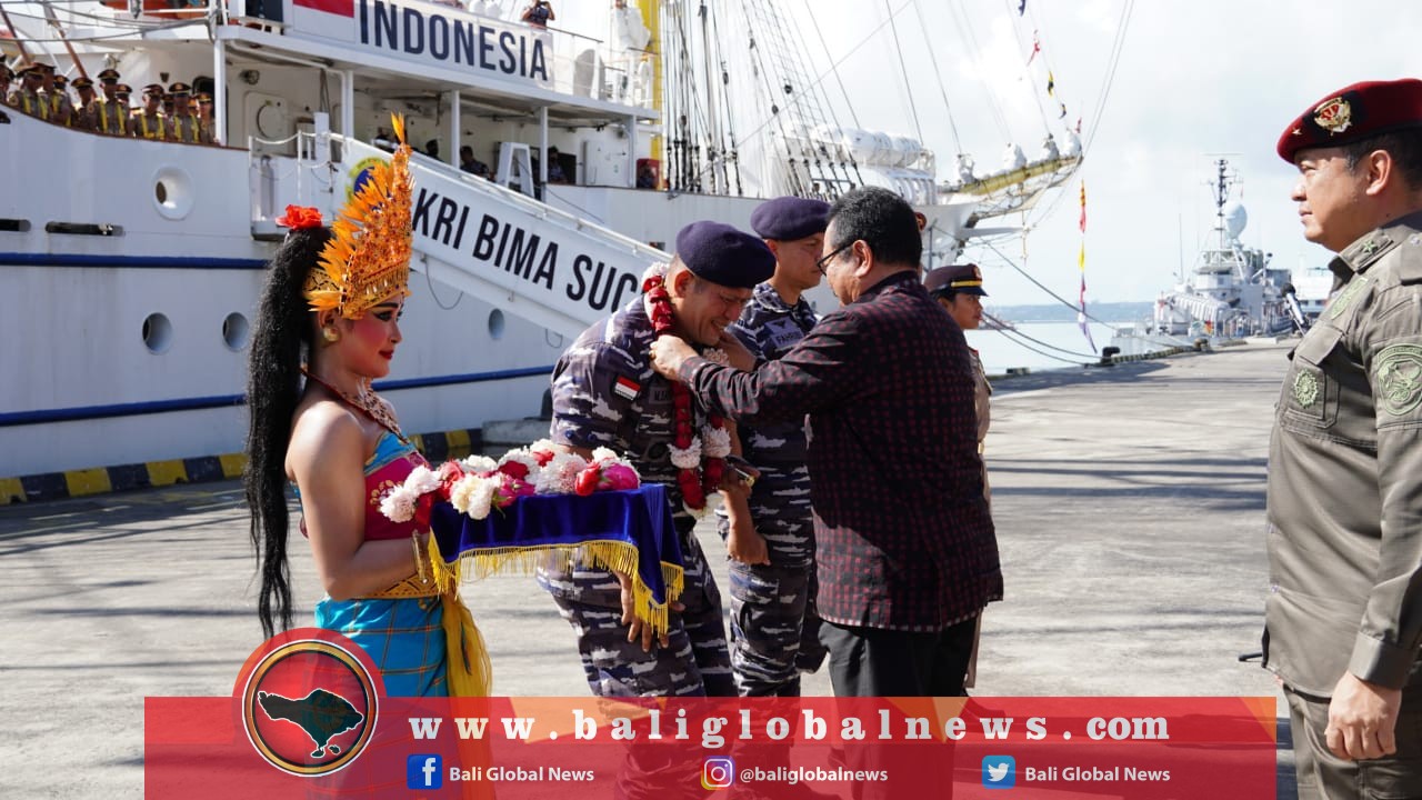 Wakil Gubernur Bali, Tjokorda Oka Artha Ardhana Sukawati (Cok Ace) bersama jajaran Forum Komunikasi Pimpinan Daerah (Forkopimda) Bali menyambut kedatangan KRI Bima Suci-945 yang bersandar di Dermaga Timur Pelabuhan Benoa, Selasa (11/10/2022). Ini adalah kali kedua KRI Bima Suci singgah di perairan Bali setelah sandar perdana pada bulan Oktober 2019 lalu. Penyambutan kapal latih yang diresmikan pada tahun 2017 ini ditandai pengalungan bunga oleh Wagub Cok Ace kepada Komandan KRI Bima Suci-945 Letkol Laut (P) Muhammad Sati Lubis.
