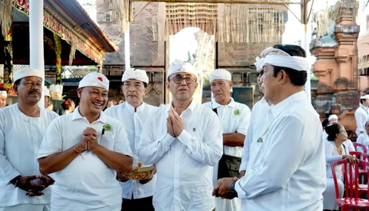 Walikota Denpasar, I Gusti Ngurah Jaya Negara, menghadiri karya piodalan padudusan alit melaspas lan pasupati Pelawatan Ida Bhatara Ring Pura Desa Lan Puseh Desa Adat Pemogan pada Minggu (7/7/2024).