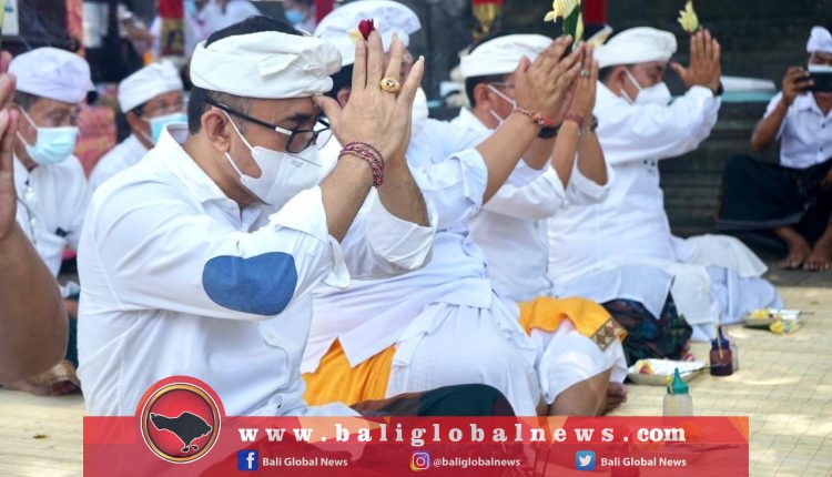 Walikota Denpasar, IGN Jaya Negara sembahyang saat puja wali di Pura Taman Sari, Desa Dangin Puri Kangin, Kecamatan Denpasar Utara, Senin (26/4).Walikota mengatakan puja wali di Pura Taman Sari ini merupakan wujud bakti warga Desa Dangin Puri Kangin, sehingga pelaksanaan yadnya ini dapat menjadi momentum atau sebagai ajang mulatsarira serta meningkatkan sradha dan bhakti umat dalam menjalankan swadarma. Walaupun dengan keterbatasan dan prokes yang ketat di dalam pelaksanaannya.