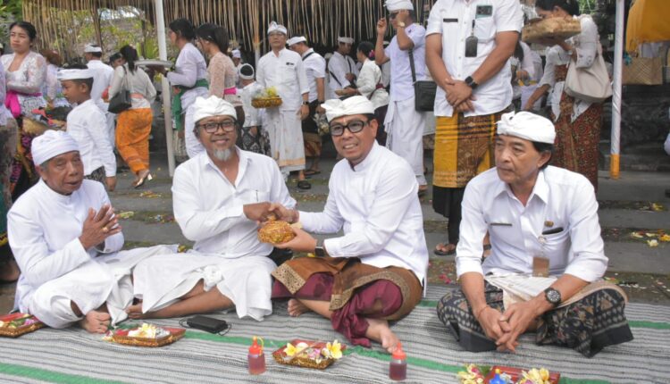 Wakil Walikota Denpasar I Kadek Agus Arya Wibawa ngaturang bakti pujawali padudusan alit di Pura Luhur Candi Narmada Tanah Kilap pada Purnama Sasih Kasa, Kamis (10/7/2025).